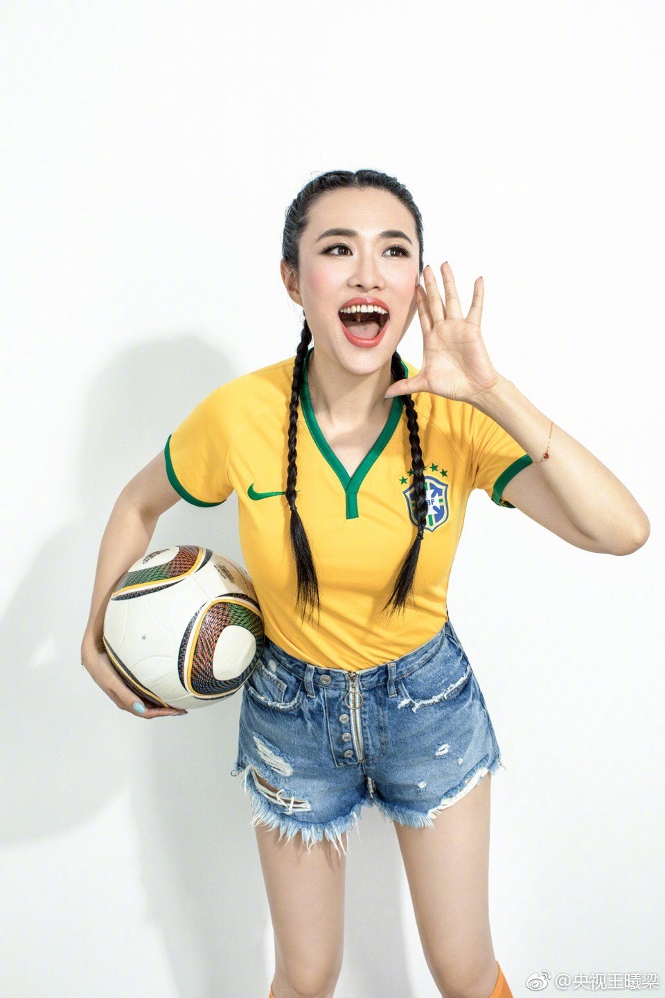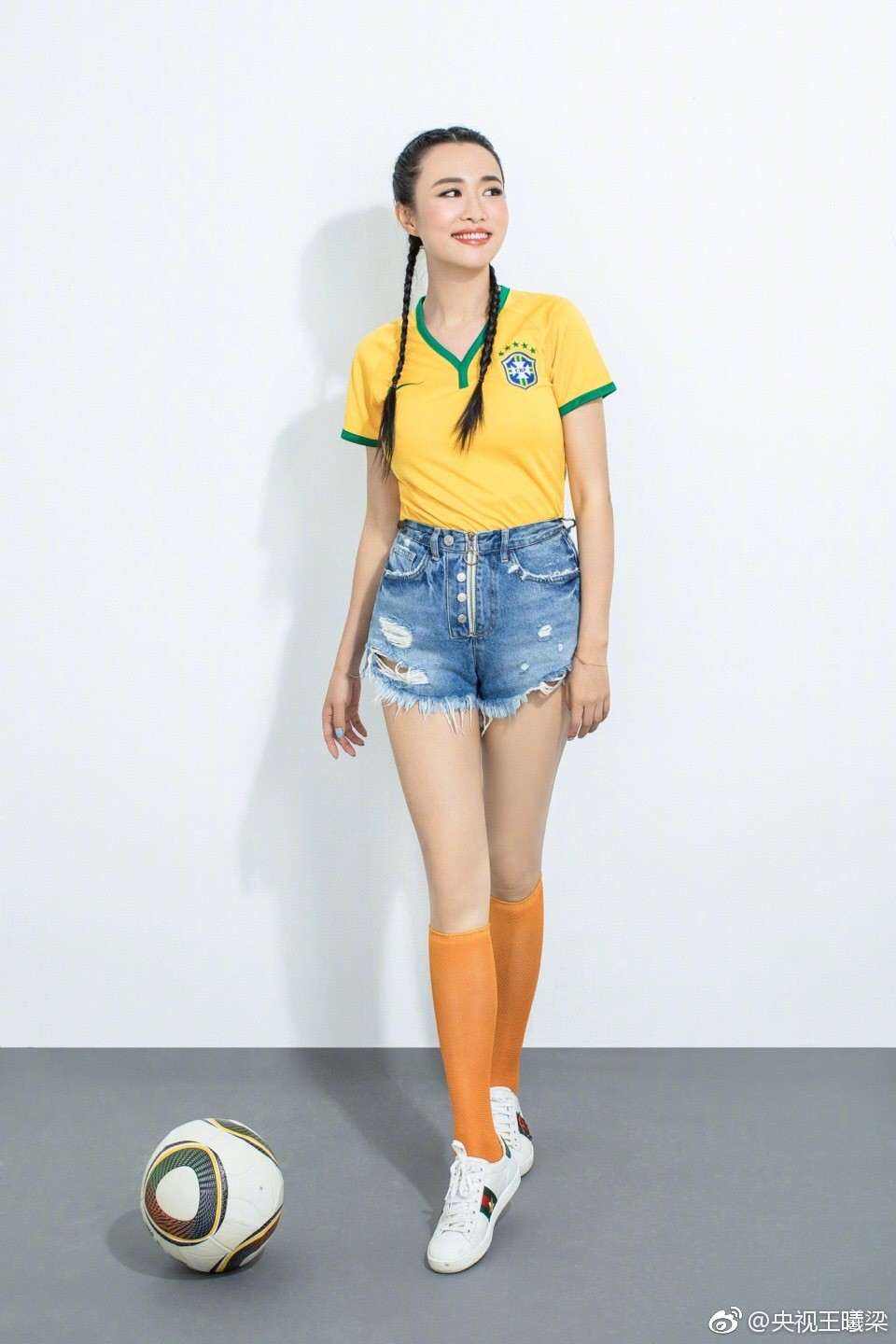 这组写真展现了王曦梁对足球运动的热爱与独特的时尚诠释。她身着一件经典的蓝色足球训练上衣,搭配利落的牛仔短裤,将运动活力与日常时尚完美融合。最引人注目的是那双亮眼的橘色丝袜,不仅大胆地突破了传统运动装的色彩框架,更与她脚下简洁的白色运动鞋一同,衬托出健康修长的腿部线条。这让人不难理解为何她会被观众和媒体亲切地称为“央视第一美腿”和“天足大长腿”。写真中的她,或手持足球嫣然浅笑,或奔跑跃动充满力量,每一帧画面都洋溢着阳光与健康的气息。